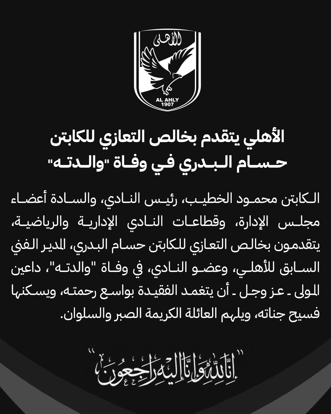 وجاء بيان الأهلي كالتالي: رئيس النادي، وأعضاء مجلس الإدارة، وقطاعات النادي الإدارية والرياضية يتقدمون بخالص التعازي للكابتن حسام البدري المدير الفني السابق للأهلي، وعضو النادي، في وفاة والدته، داعين المولى - عز وجل - أن يتغمد الفقيدة بواسع رحمته، ويسكنها فسيح جناته، ويلهم العائلة الكريمة الصبر والسلوان.