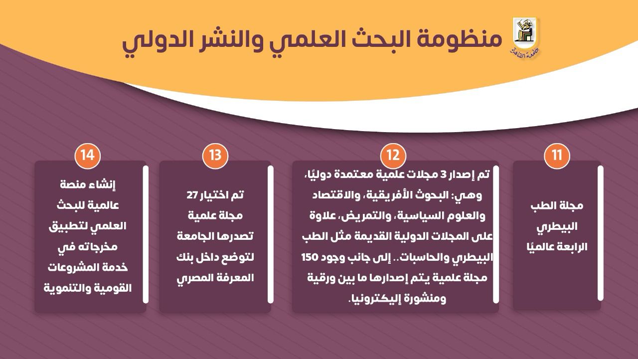 كما أشار التقرير إلى وضع الخطط البحثية المتقدمة، وتطوير وإنشاء المعامل، وتشكيل الفرق البحثية ودعمها معنويًا وماديًا ولوجستيًا، والتدريب على النشر الدولي، وزيادة عدد الأبحاث المنشورة دوليًا، واستقدام الأساتذة والباحثين الأجانب والذي يتماشى مع رؤية الدولة المصرية والخطة الاستراتيجية للجامعة ووزارة التعليم العالي والبحث العلمي، وتوجيه البحوث نحو احتياجات الدولة والمشروعات القومية وخدمة المجتمع بما ساهم في تحقيق مراكز متقدمة في التصنيفات الدولية بمختلف التخصصات، والتميز مصريًا وإقليميًا وعالميًا.