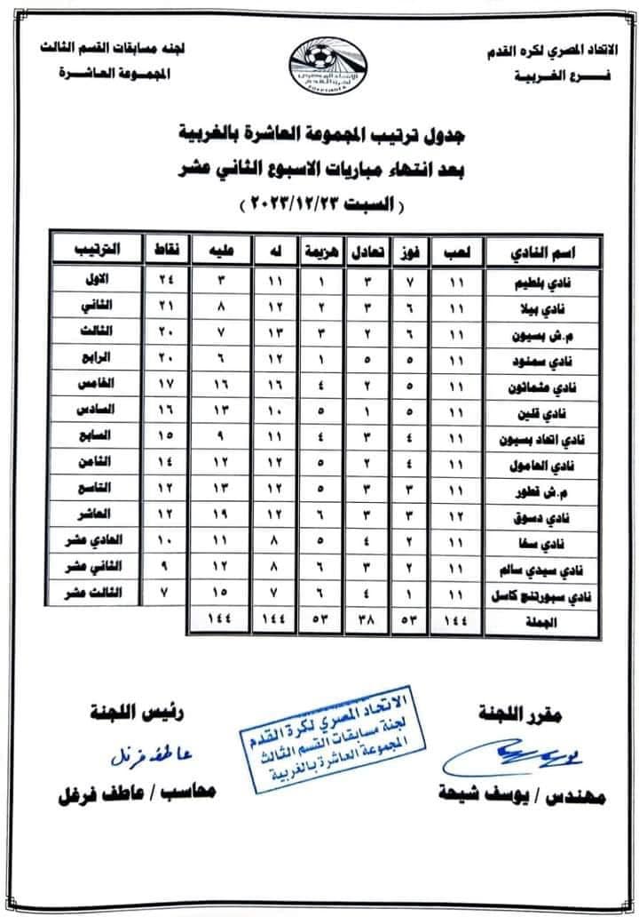 أعلنت لجنة مسابقات القسم الثالث بالاتحاد المصري لكرة القدم عن جدول ترتيب المجموعة العاشرة بعد انتهاء مباريات الجولة الثانية عشر وتضم المجموعة أندية من محافظة الغربية.