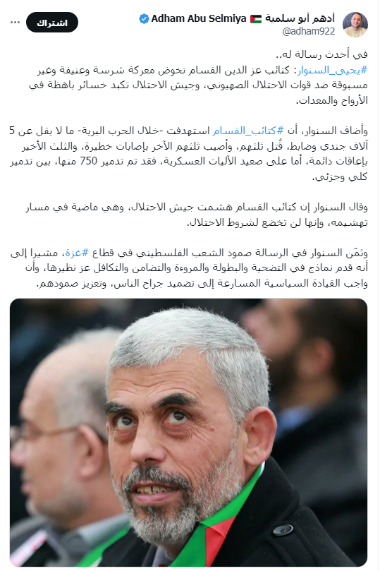 وقال الناشط السياسي الفلسطيني أدهم أبو سليمة عن رسالة يحيى السنوار: "في أحدث رسالة له.. يحيى السنوار: كتائب عز الدين القسام تخوض معركة شرسة وعنيفة وغير مسبوقة ضد قوات الاحتلال الصهيوني، وجيش الاحتلال تكبد خسائر باهظة في الأرواح والمعدات."