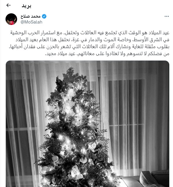 محمد صلاح: العالم يحتفل بعيد الميلاد وأهل غزة يعانون الدمار وفقدان أحبائهم
