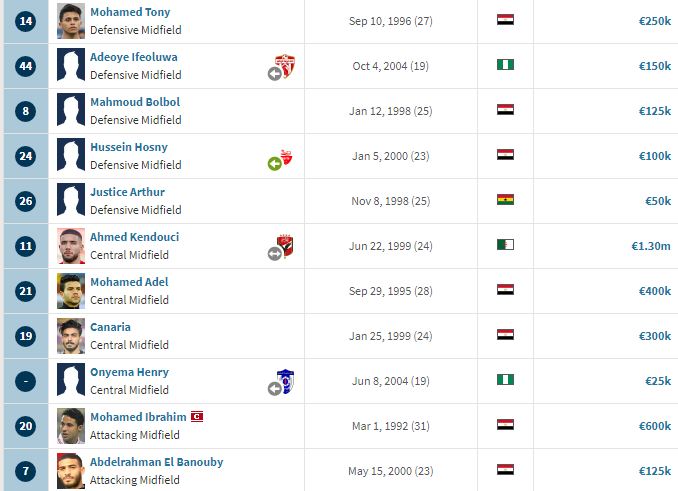 وبلغت القيمة التسويقية للمالي ديانج 4 ملايين ونصف يورو، بينما بلغت القيمة التسويقية للاعبي الوسط في فريق سيراميكا مايقارب 3 ملايين ونصف يورو وكان عددهم 11 لاعبا أبرزهم محمد ابراهيم والقندوسي.