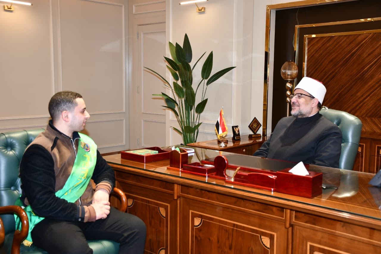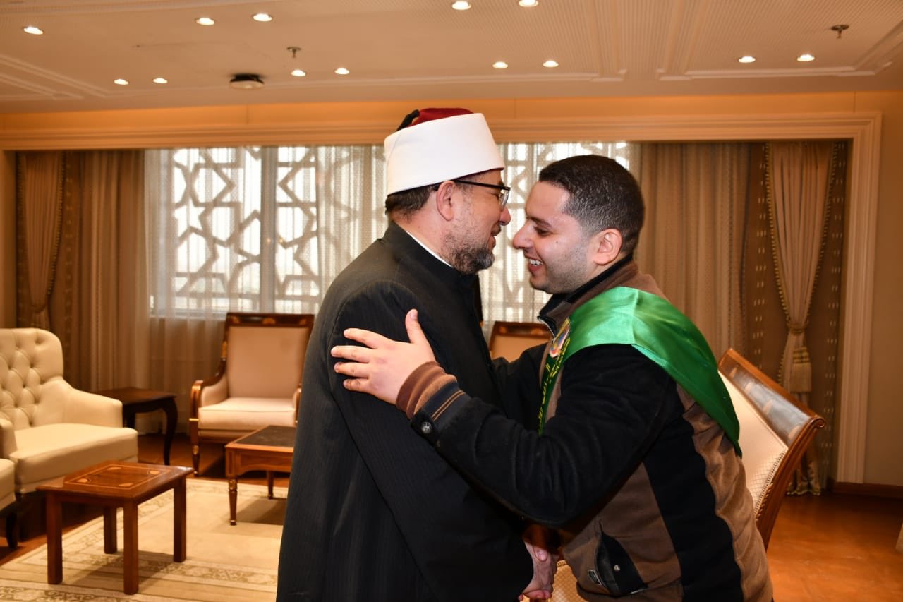 ونشر وزير الأوقاف عبر صفحته الرسمية على منصة “إكس” صورة تجمعة بالفائز وكتب عليها: “مليون تحية ومليون جنيه للفائز الأول في المسابقة العالمية للقرآن الكريم ابن كلية القرآن الكريم ومحافظة البحيرة الشيخ محمد شعبان عبد الله جعفر.، سعدت اليوم باستقباله بمكتبي وتهنئته بالفوز ”.