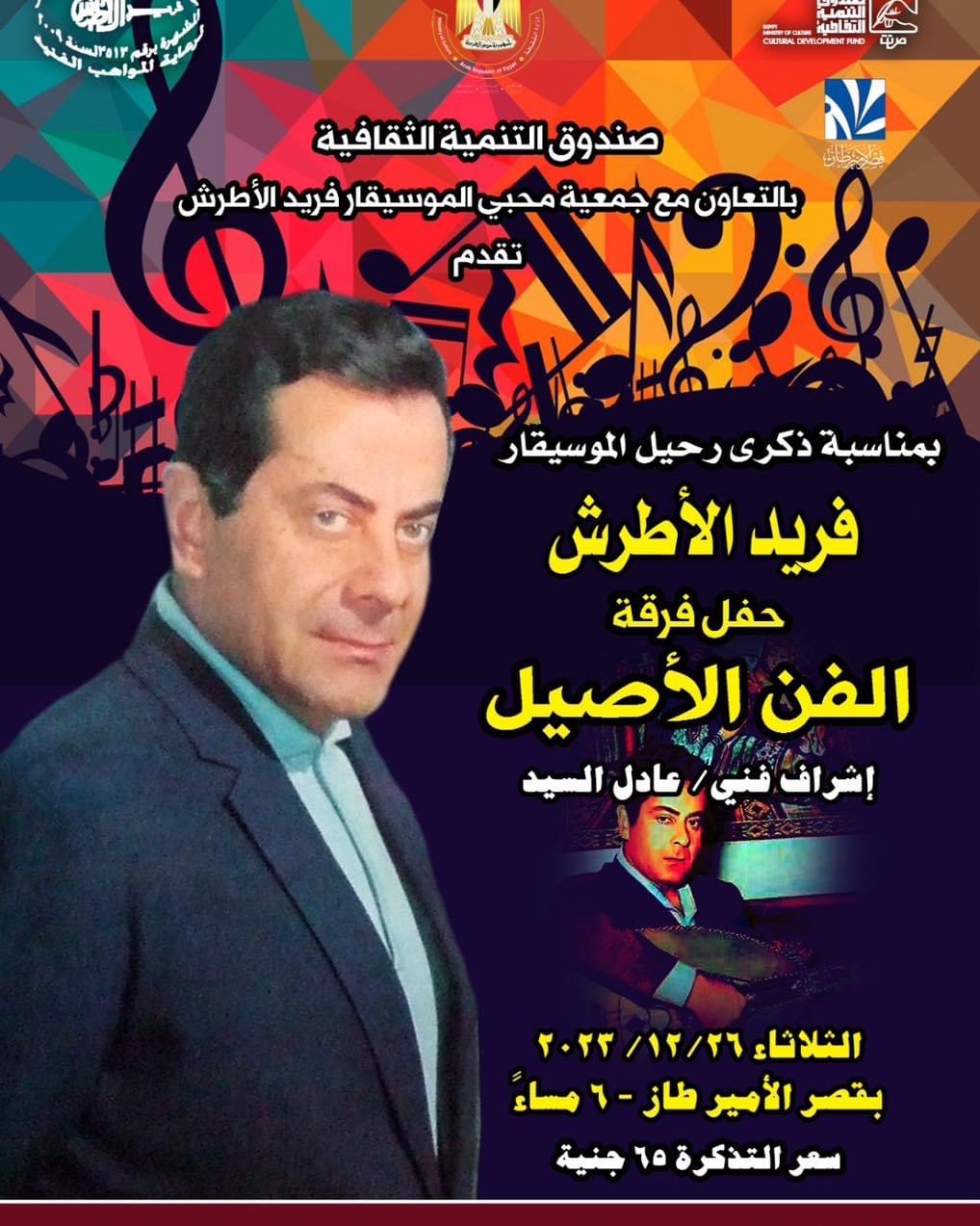 يقيم مركز إبداع قصر الأمير طاز، بالسيدة زينب، والتابع لقطاع صندوق التنمية الثقافية برئاسة الدكتور وليد قانوش، حفل جديد لفرقة "الفن الأصيل" في تمام السادسة من مساء اليوم الثلاثاء الموافق 26 ديسمبر الجاري، وذلك إحياء لذكرى رحيل الموسيقار فريد الأطرش، والتي تحل اليوم.
