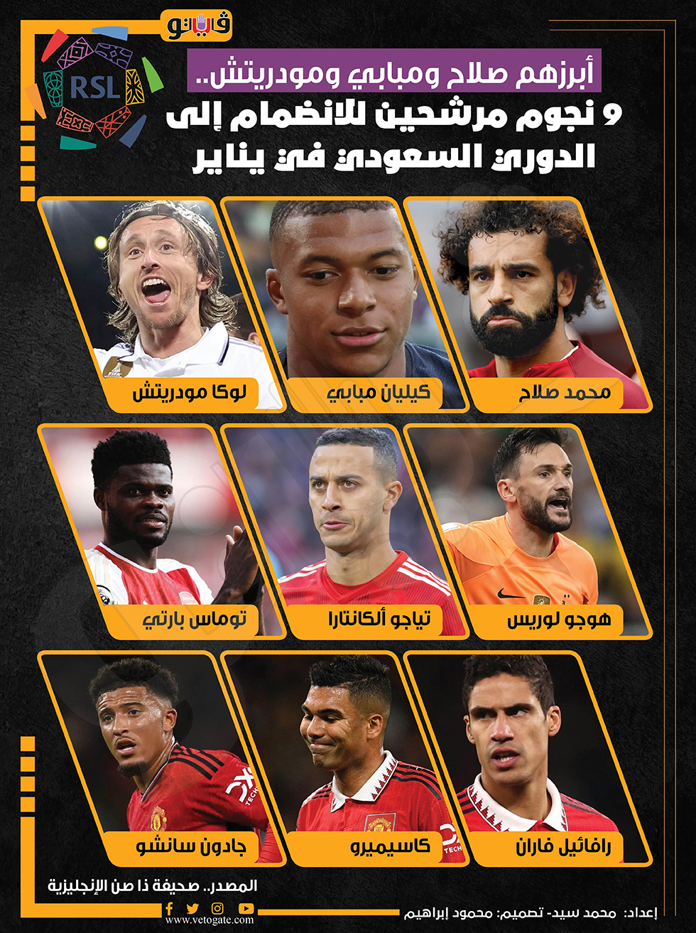 أبرزهم صلاح ومبابي ومودريتش.. 9 نجوم مرشحون للانضمام إلى الدوري السعودي في يناير (إنفوجراف) الثلاثاء 26/ديسمبر/2023 - 09:00 م 12/26/2023 9:00:27 PM اللاعبون المرشحون للانتقال للدوري السعودي، فيتو محمد سيد شارك طباعة 18 حجم الخط شارك طباعة الدوري السعودي محمد صلاح مبابي مودريتش فاران كاسيميرو