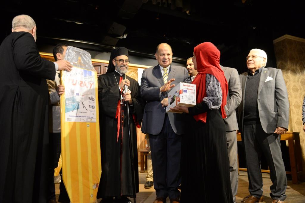 و سلم المحافظ ومطران الأقباط الكاثوليك ومدير جهاز تنمية المشروعات ؛ أدوات ومعدات المشروعات كـ( الخياطة والتطريز ومشغولات يدوية وكوافير وتبريد وتكييف.....) وغيرها لتوفير فرص عمل التدريب من أجل التشغيل حيث تم توزيع 85 مشروع بمنحة قدرها مليون و600 ألف جنيه.