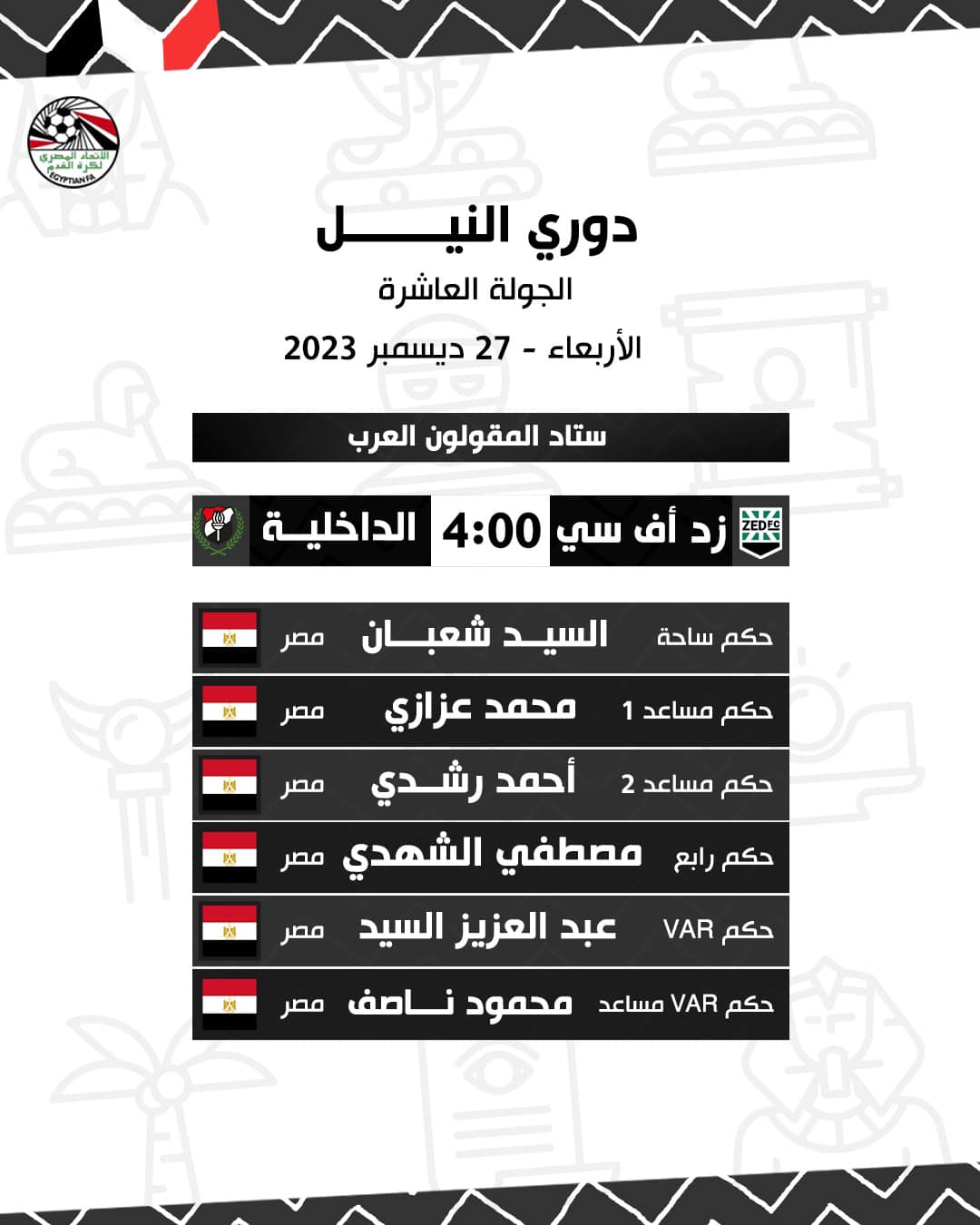 وتقام مباراة زد إف سي مع الداخلية في الرابعة عصرا بستاد المقاولون العرب بالجبل الأخضر ويديرها السيد شعبان حكما للساحة ويعاونه كلا من محمد عزازي مساعد أول وأحمد رشدي مساعد ثاني ومصطفي الشهدي حكما رابعا وعبدالعزيز السيد حكم فيديو ومحمود ناصف حكم فيديو مساعد.