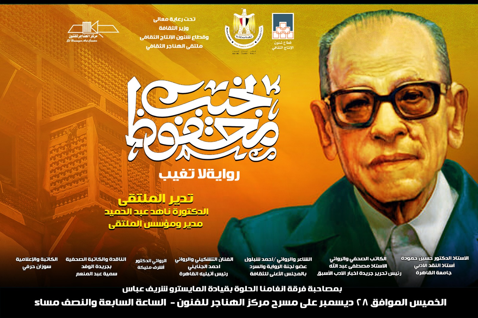 ينظم قطاع شئون الإنتاج الثقافى برئاسة المخرج خالد جلال، ملتقى الهناجر الثقافي الذى يأتى هذا الشهر تحت عنوان "نجيب محفوظ.. رواية لا تغيب"، وذلك في تمام السابعة والنصف من مساء غدا الخميس الموافق 28 ديسمبر الجاري، بمركز الهناجر للفنون بدار الأوبرا المصرية.