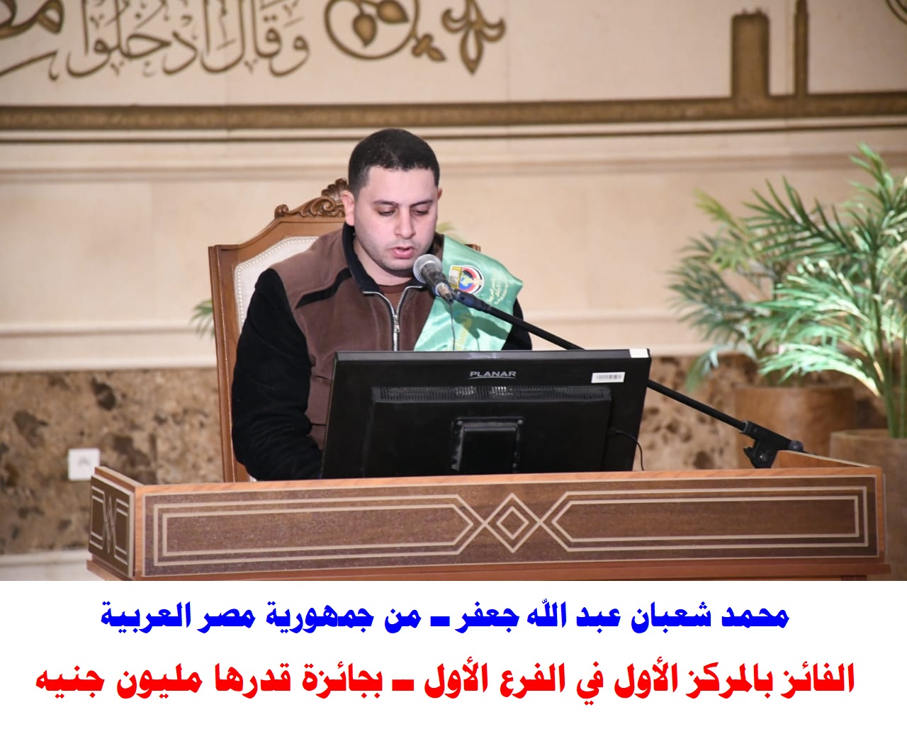 محمد شعبان عبد الله جعفر ــ من جمهورية مصر العربية ــ طالب بكلية القرآن الكريم ــ من محافظة البحيرة ــ الفائز بالمركز الأول في الفرع الأول ــ بجائزة قدرها مليون جنيه.