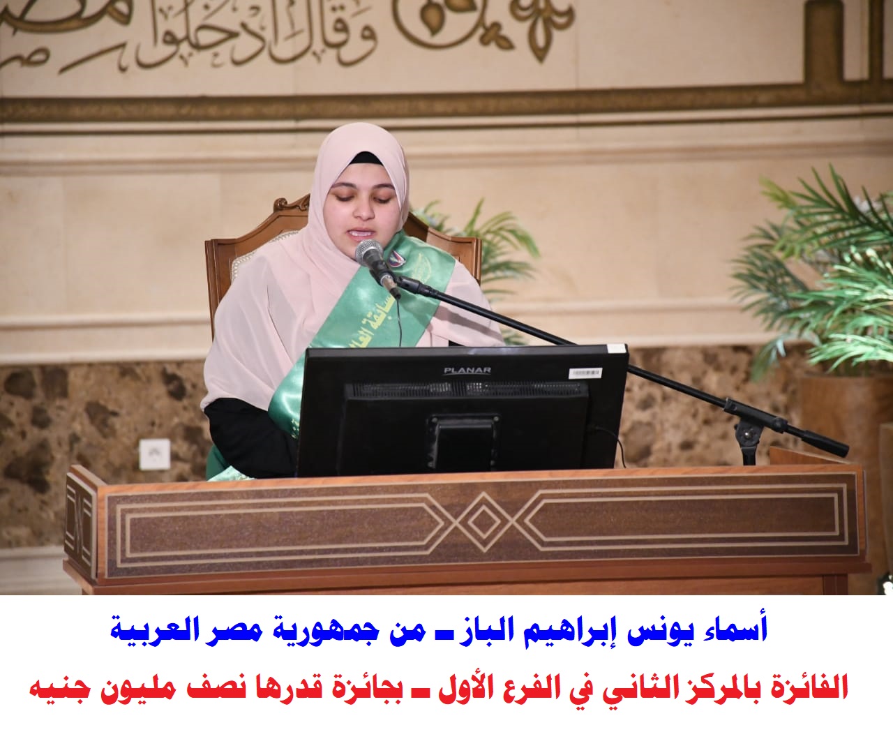 أسماء يونس إبراهيم الباز ــ من جمهورية مصر العربية ــ طالبة بكلية الدراسات الإسلامية والعربية ــ من محافظة الدقهلية ــ الفائزة بالمركز الثاني في الفرع الأول ــ بجائزة قدرها نصف مليون جنيه