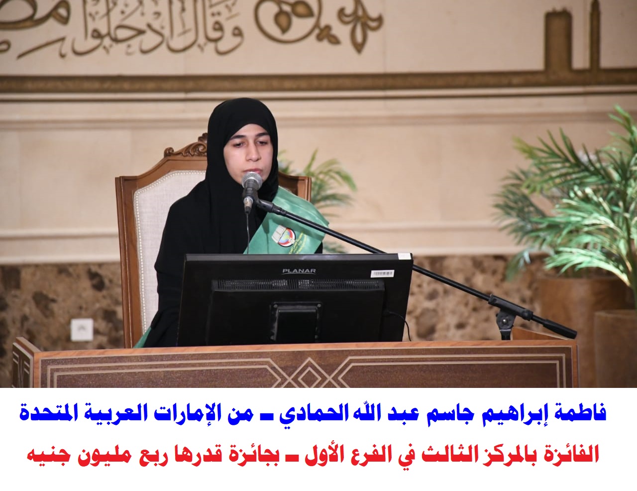 فاطمة إبراهيم جاسم عبد الله الحمادي ــ من دولة الإمارات العربية المتحدة ــ الفائزة بالمركز الثالث في الفرع الأول ــ بجائزة قدرها ربع مليون جنيه