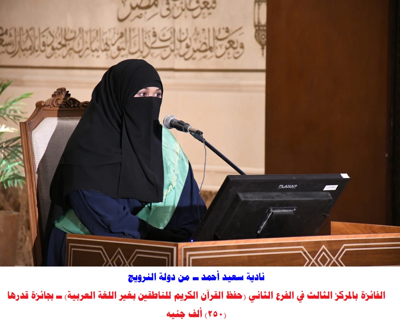 نادية سعيد أحمد ــ من دولة النرويج ــ الفائزة بالمركز الثالث في الفرع الثاني ــ بجائزة قدرها 250 ألف جنيه