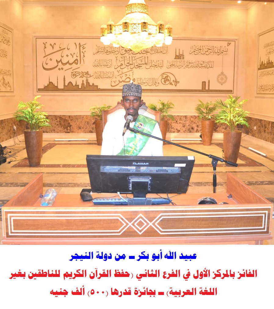 عبيد الله أبو بكر ــ من دولة النيجر ــ الفائز بالمركز الأول في الفرع الثاني ــ بجائزة قدرها 500 ألف جنيه