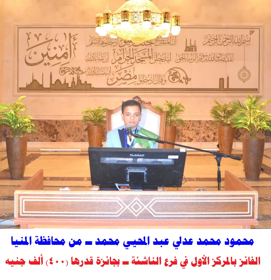 محمود محمد عدلي عبد المحيي محمد من محافظة المنيا، الفائز بالمركز الأول في فرع الناشئة بجائزة قدرها (400) ألف جنيه.