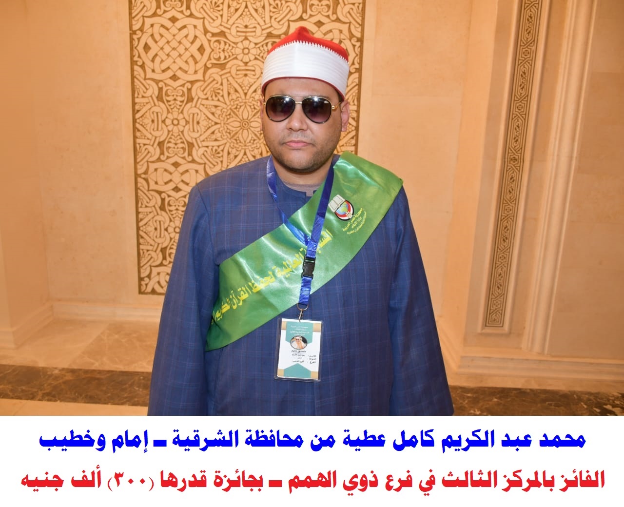 محمد عبد الكريم كامل عطية من محافظة الشرقية ــ إمام وخطيب بوزارة الأوقاف ــ الفائز بالمركز الثالث في فرع ذوي الهمم ــ بجائزة قدرها 300 ألف جنيه