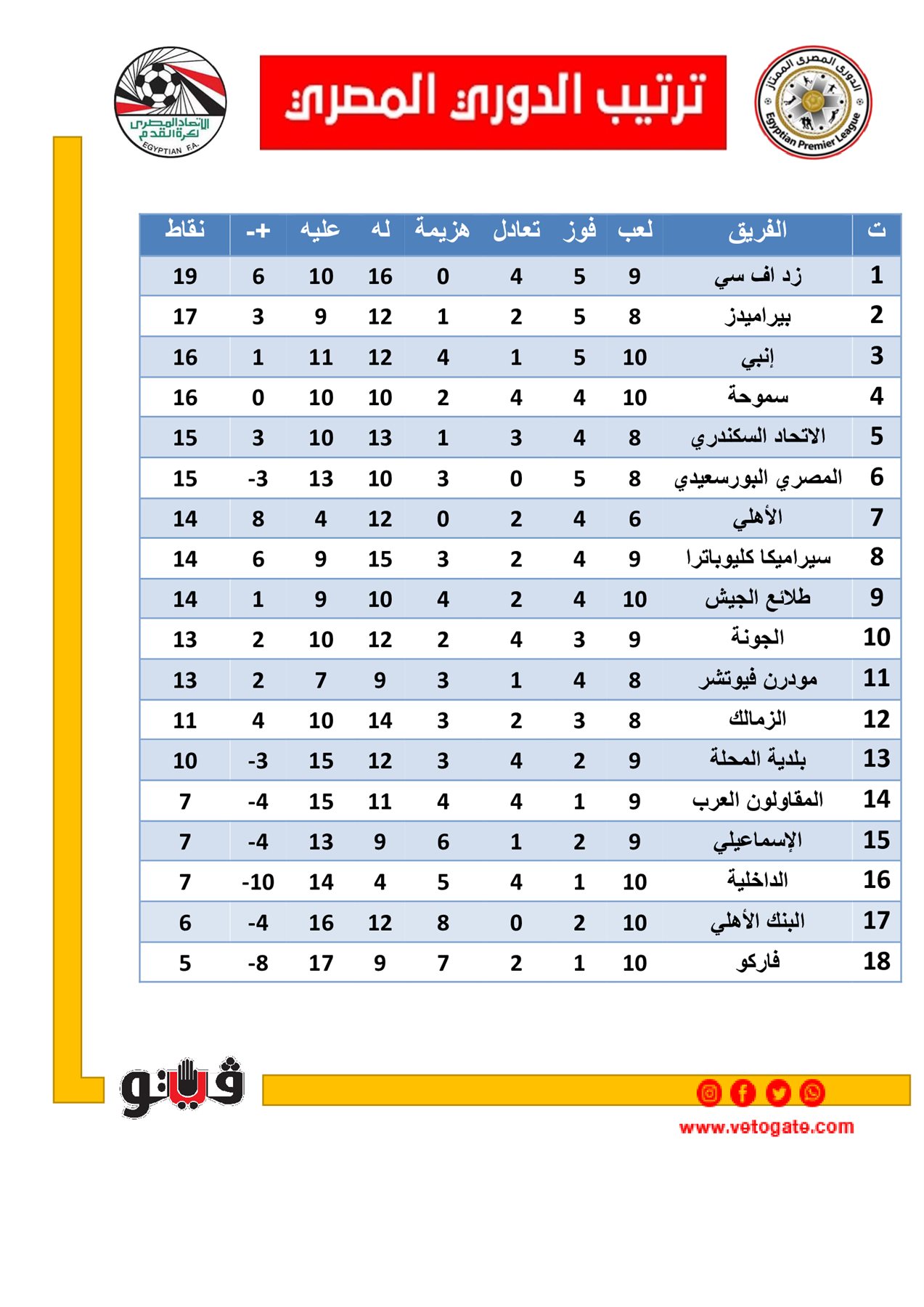 زد يتصدر ترتيب الدوري المصري الممتاز بعد الجولة العاشرة