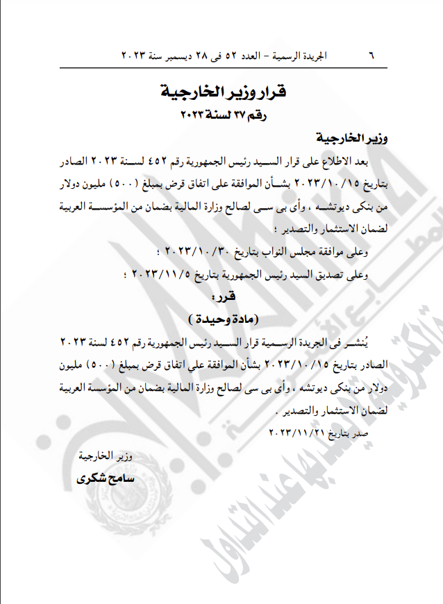 -والقرار الجمهوري رقم 452 لسنة 2023، بشأن الموافقة على اتفاقية قرض بمبلغ (500) مليون دولار من بنكى ديوتشه، وأي بي سي لصالح وزارة المالية بضمان من المؤسسة العربية لضمان االستثمار والتصدير.
