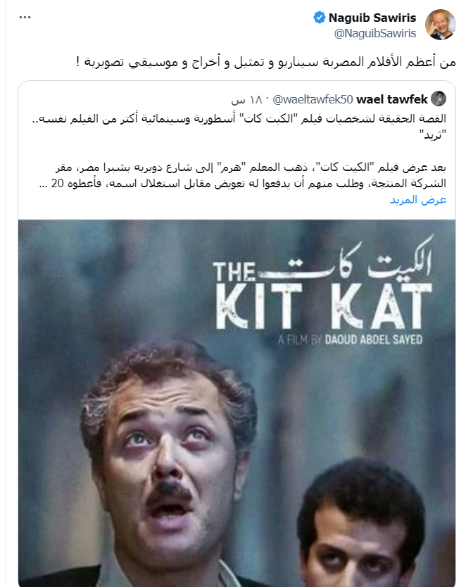 وكان وائل توفيق، أحد المتابعين، تحدث عن قصة فيلم "الكيت كات" فقال: "عن القصة الحقيقية لـشخصيات فيلم "الكيت كات" أسطورية وسينمائية أكتر من الفيلم نفسه.. بعد عرض فيلم "الكيت كات"، ذهب المعلم "هرم" إلى شارع دوبريه بشبرا مصر، مقر الشركة المنتجة، وطلب منهم أن يدفعوا له تعويض مقابل استغلال اسمه، فأعطوه 20 جنيهًا ومشي".