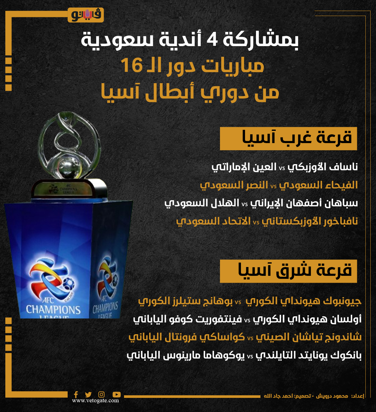 بمشاركة 4 أندية سعودية.. مباريات دور الـ 16 من دوري أبطال آسيا (إنفوجراف) الخميس 28/ديسمبر/2023 - 08:00 م 12/28/2023 8:00:59 PM مباريات دور الـ 16 لدوري أبطال آسيا، فيتو محمود درويش شارك طباعة 18 حجم الخط شارك طباعة دوري أبطال آسيا قرعة دوري ابطال اسيا الفيحاء السعودي النصر السعودي سبهان أصفهان الإيراني الهلال السعودي الاتحاد السعودي