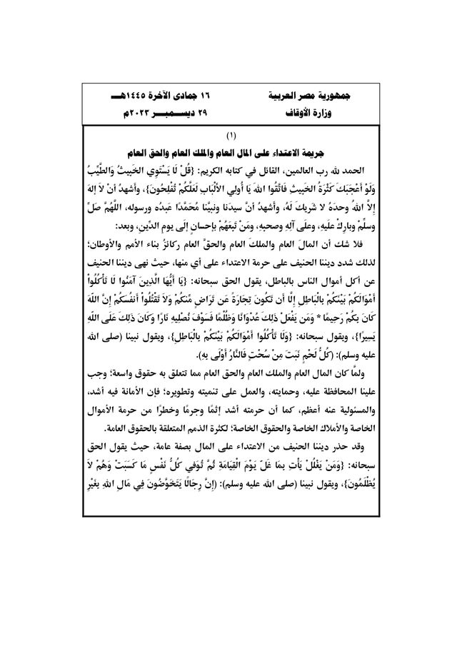 حددت وزارة الأوقاف موضوع خطبة اليوم الجمعة تحت عنوان “جريمة الاعتداء على المال العام والملك العام والحق العام”.