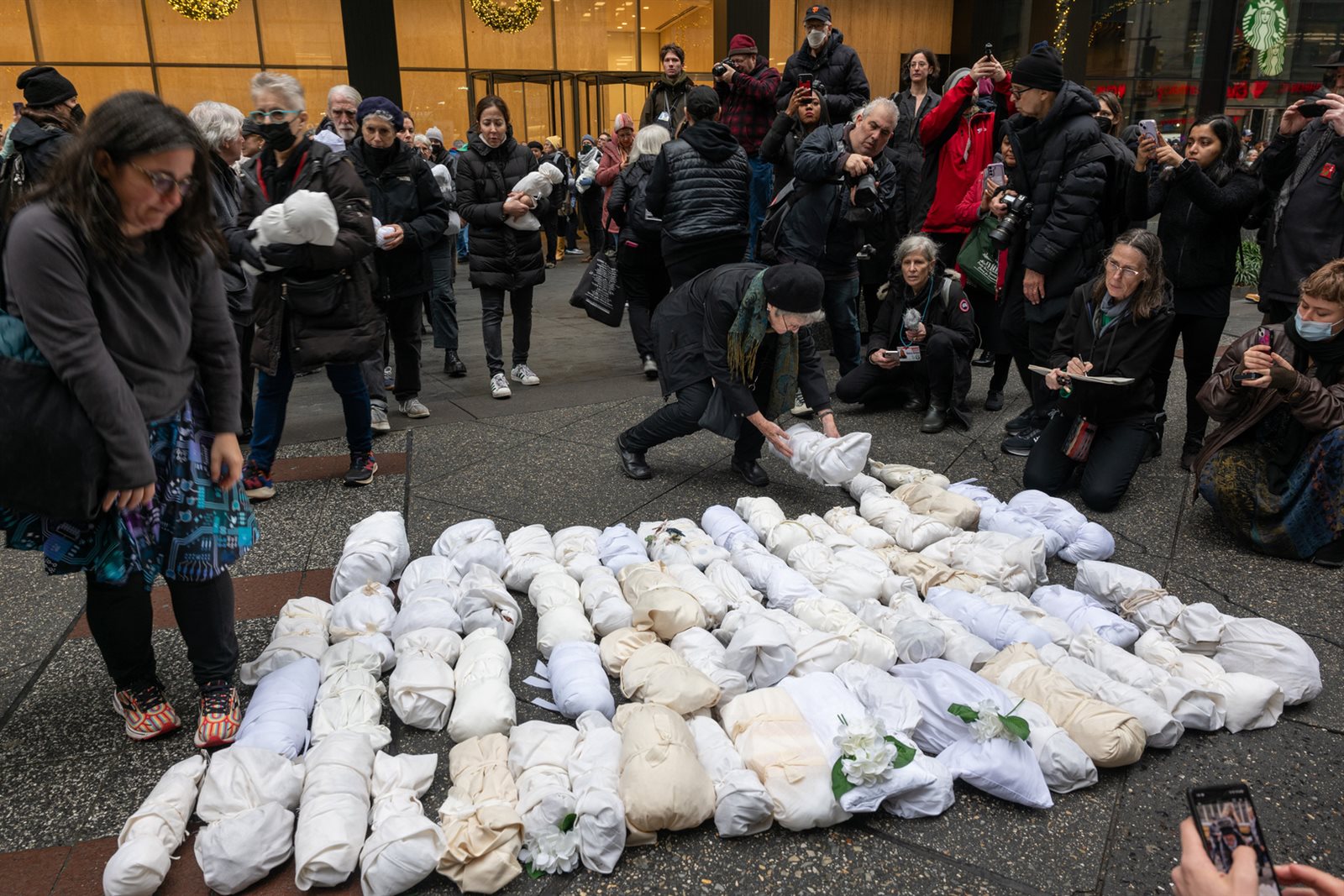شارك مئات المتظاهرين، متوشحين بالسواد وحاملين دمى تمثل أطفالًا قتلى، في موكب جنائزي رمزي في مدينة نيويورك الأمريكية للمطالبة بوقف إطلاق النار وإنهاء القصف الإسرائيلي المدمر في غزة.