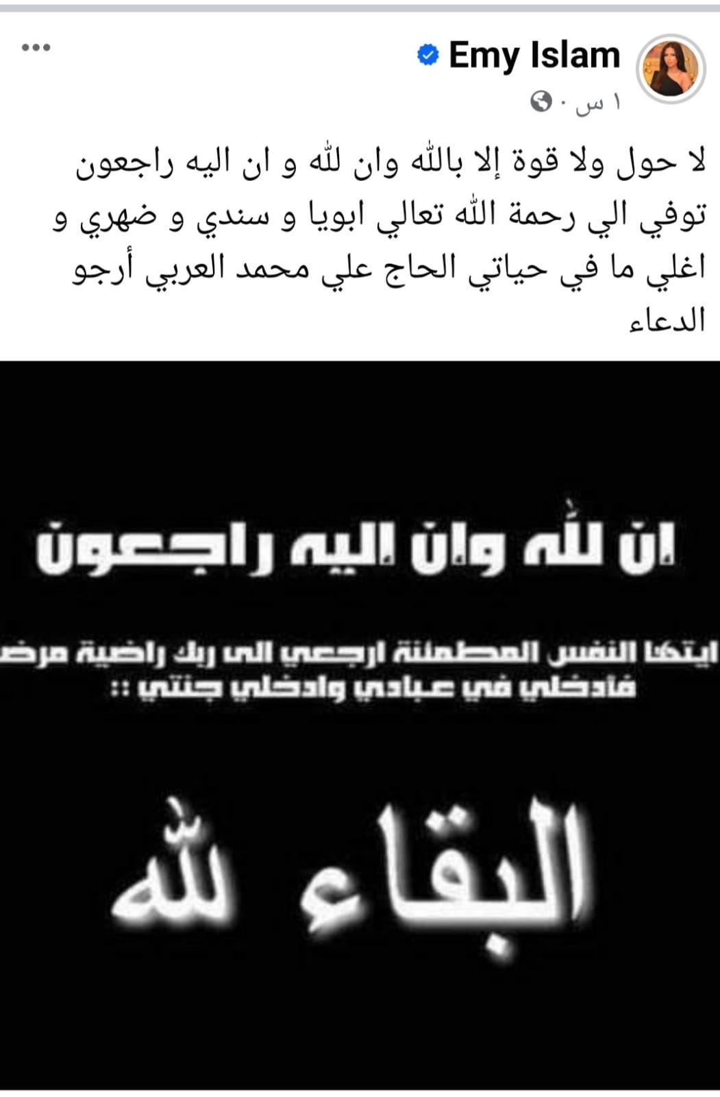 وكتبت إيمي إسلام عبر حسابها على فيس بوك، الآتي: لا حول ولا قوة إلا بالله وإنا لله وإنا إليه راجعون.. توفى إلى رحمة الله تعالى أبويا وسندي وضهري وأغلى ما في حياتي الحاج علي محمد العربي.. أرجو الدعاء.