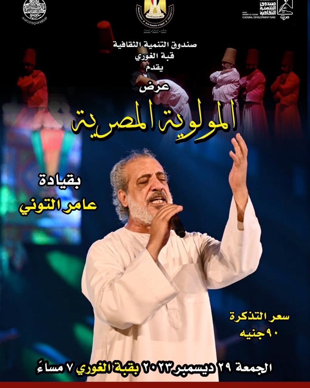 يقيم مركز إبداع بقبة الغوري، التابع لقطاع صندوق التنمية الثقافية برئاسة الدكتور وليد قانوش في السابعة من مساء اليوم الجمعة الموافق 29 ديسمبر الجاري، حفلا للفنان عامر التوني وفرقته "المولوية".