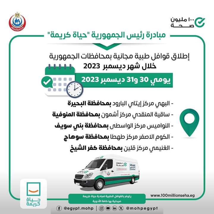 أعلنت وزارة الصحة والسكان إطلاق 5 قوافل طبية ضمن مبادرة رئيس الجمهورية حياة كريمة يومي ٣٠ و٣١ ديسمبر ٢٠٢٣ للكشف والعلاج مجانًا في التخصصات الطبية “نساء وولادة - خدمات تنظيم الأسرة - الأطفال الباطنة - الأنف والأذن والعظام - الجراحة - الرمد الأسنان - القلب - الجلدية وخدمات الأشعة والتحاليل”.
