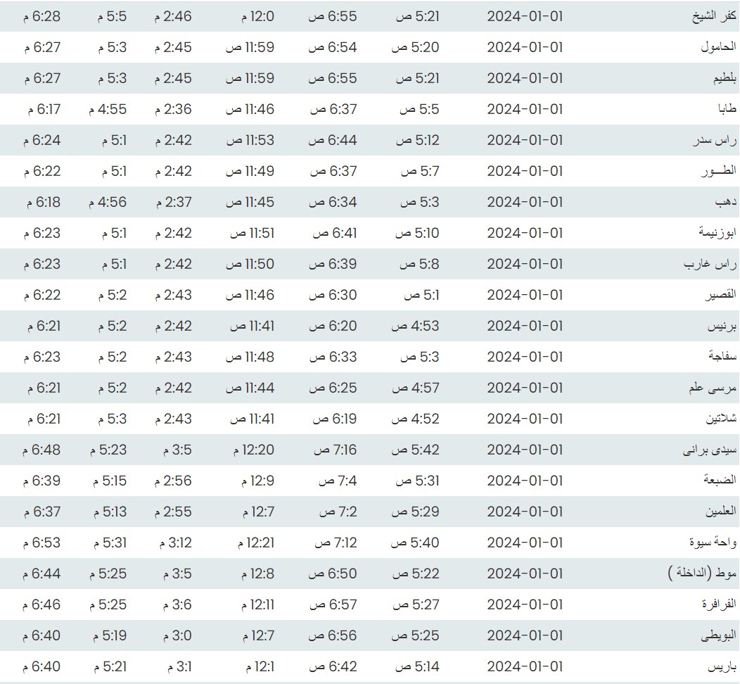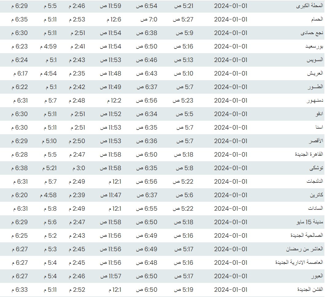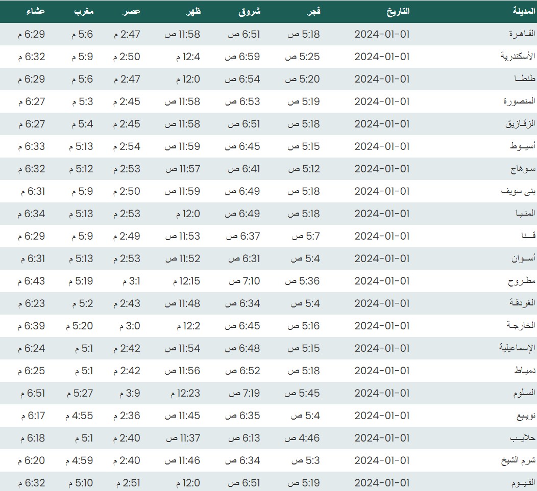وفيما يلي مواقيت الصلاة، لعدد من مدن ومحافظات الجمهورية من واقع بيانات الهيئة العامة للمساحة