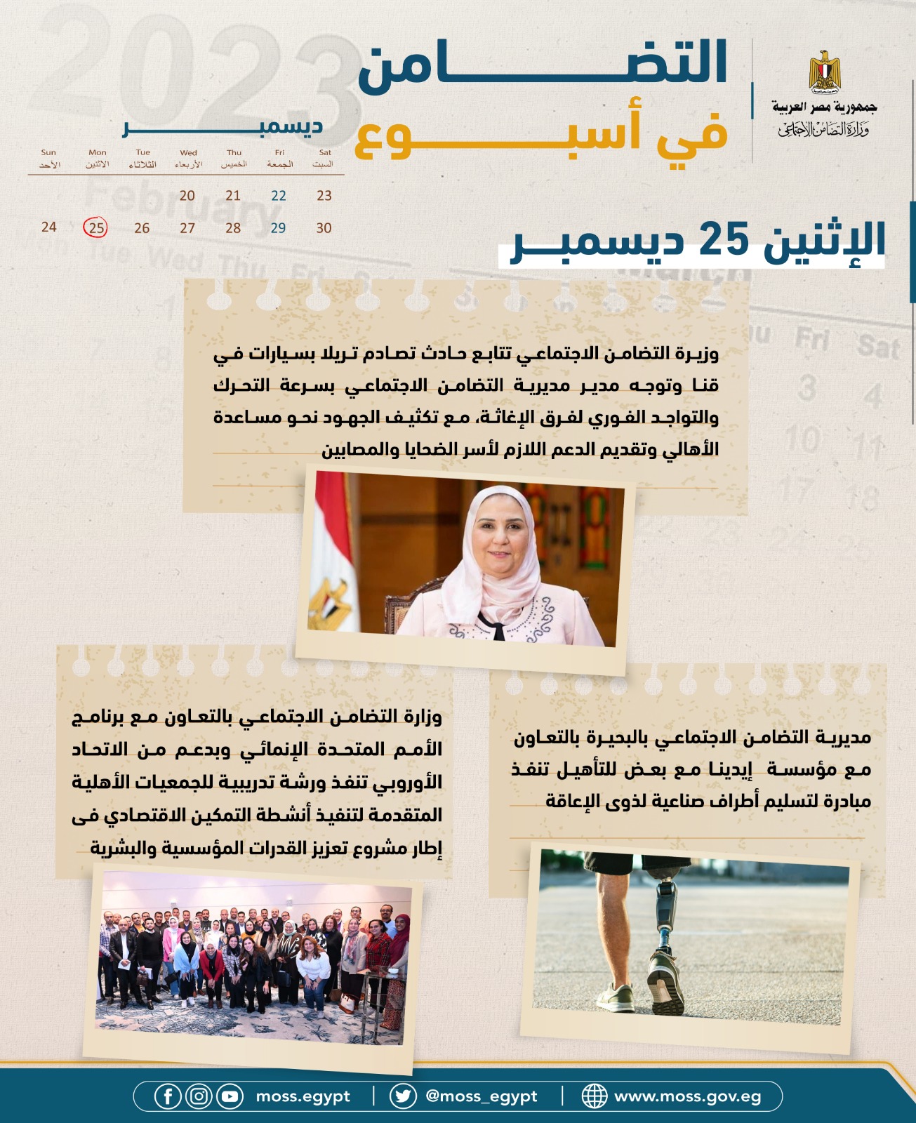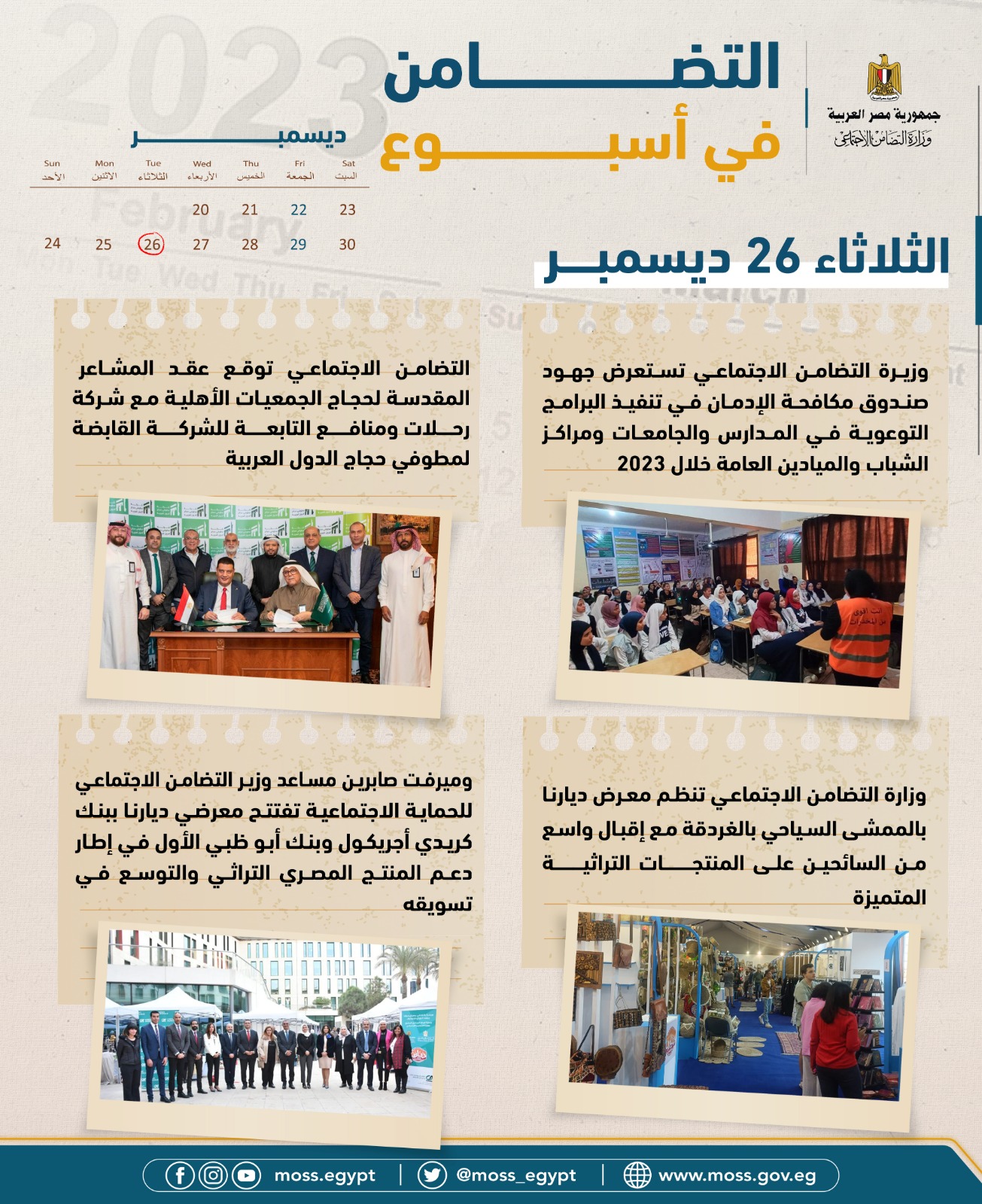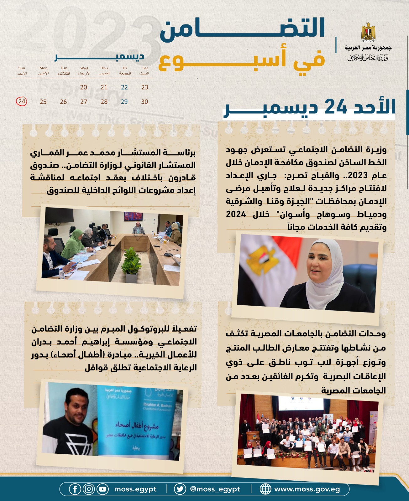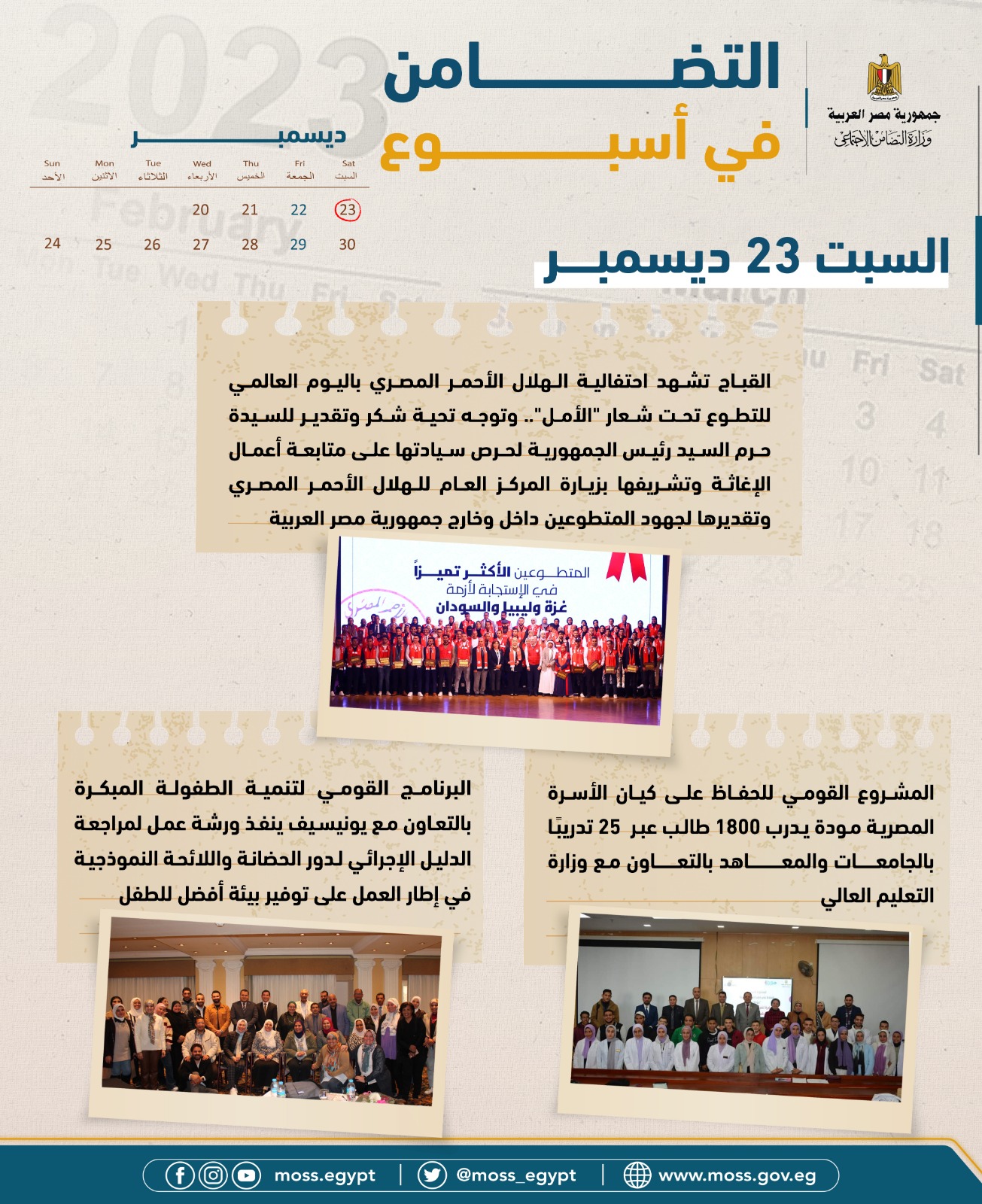 نشرت وزارة التضامن الاجتماعي الحصاد الأسبوعي لرصد أنشطة وزارة التضامن الاجتماعي في الفترة من الفترة من 22 ديسمبر إلى 28 ديسمبر 2023