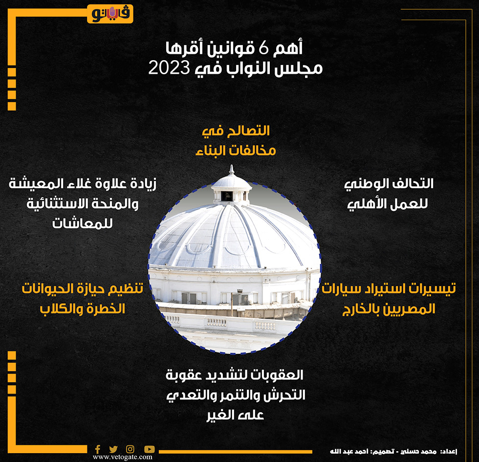 أهم 6 قوانين أقرها مجلس النواب في 2023 (إنفوجراف) الأحد 31/ديسمبر/2023 - 12:26 م 12/31/2023 12:26:14 PM محمد حسنى شارك طباعة 18 حجم الخط شارك طباعة