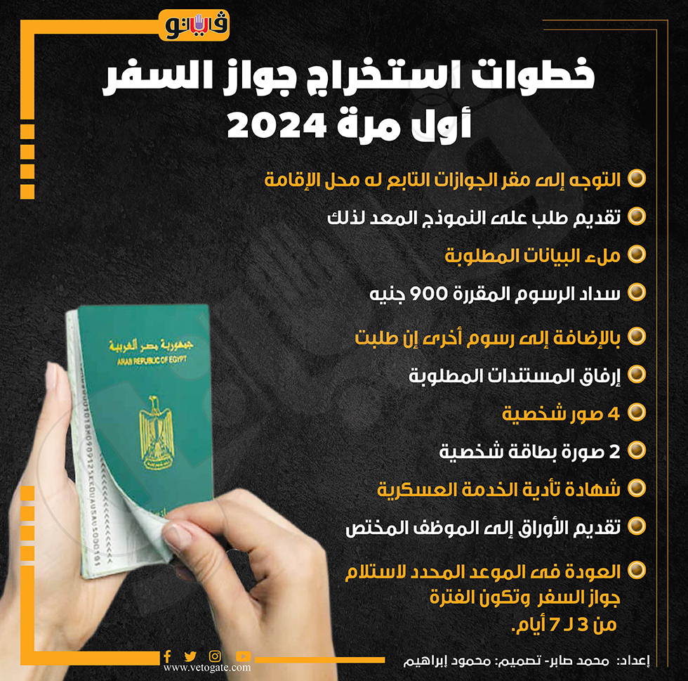 خطوات استخراج جواز السفر أول مرة 2024 (إنفوجراف) الثلاثاء 02/يناير/2024 - 08:00 م 1/2/2024 8:00:53 PM خطوات استخراج جواز السفر، فيتو محمد صابر شارك طباعة 18 حجم الخط شارك طباعة جواز السفر 2024 استخراج جواز سفر VIP استخراج جواز السفر السريع هل يجوز استخراج جواز السفر من أي مكان داخل مصر إجراءات استخراج جواز سفر مصري مستعجل استعلام عن جواز سفر مصري اسعار استخراج جواز السفر مدة إصدار جواز السفر الرسوم المطلوبة لاستخراج جواز سفر
