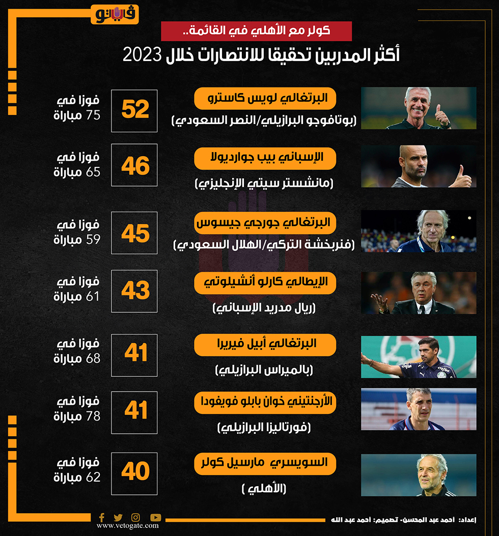 كولر مع الأهلي في القائمة.. أكثر المدربين تحقيقا للانتصارات خلال 2023 (إنفوجراف) الأحد 31/ديسمبر/2023 - 08:17 م 12/31/2023 8:17:39 PM كولر محمود درويش شارك طباعة 18 حجم الخط شارك طباعة لويس كاسترو بيب جوارديولا جورجى جيسوس كارلو انشيلوتي مارسيل كولر