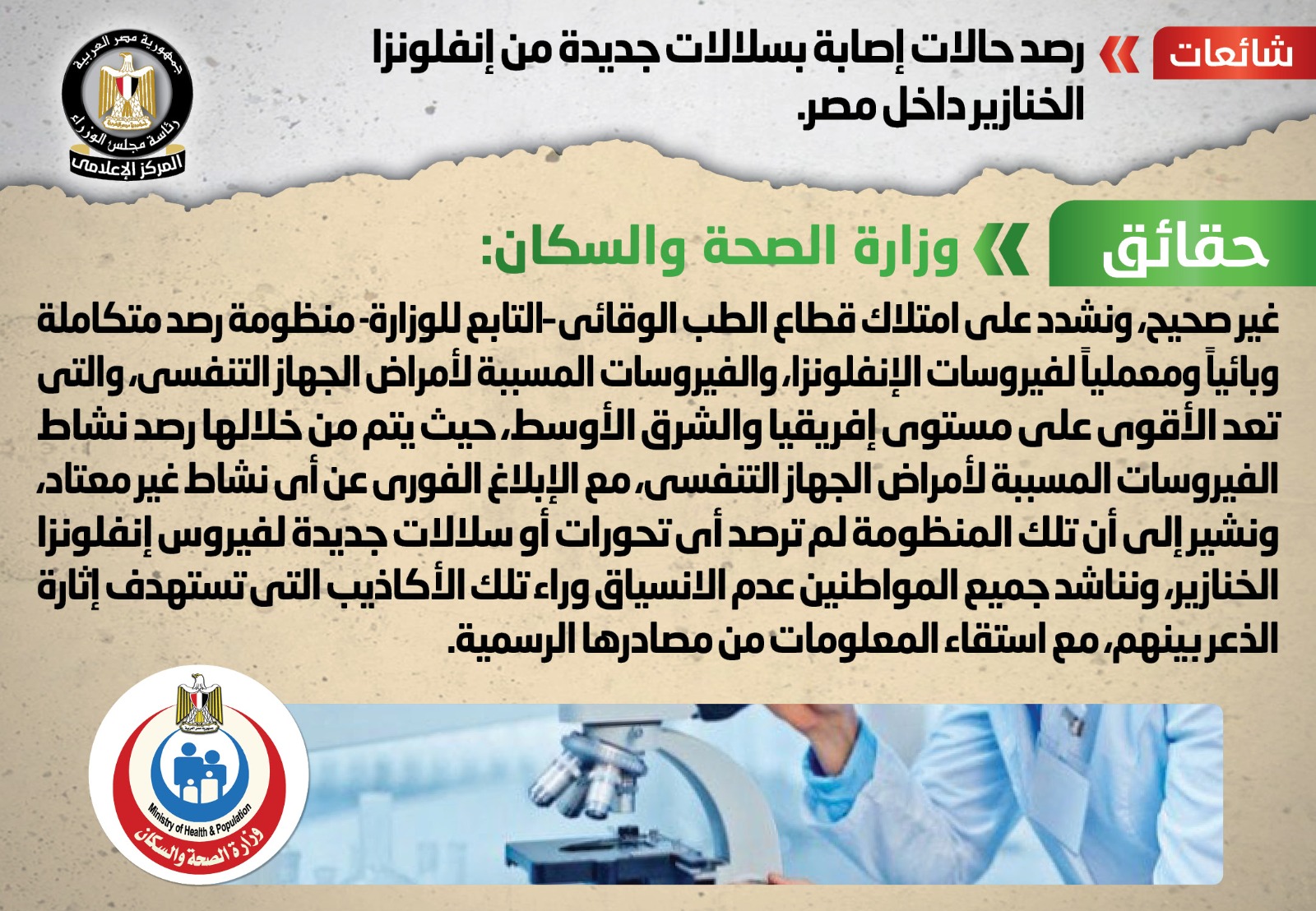 وقام المركز الإعلامي لمجلس الوزراء بالتواصل مع وزارة الصحة والسكان، والتي نفت تلك الأنباء، مُؤكدةً أنه لا صحة لرصد أي إصابات بسلالات جديدة من إنفلونزا الخنازير داخل مصر.