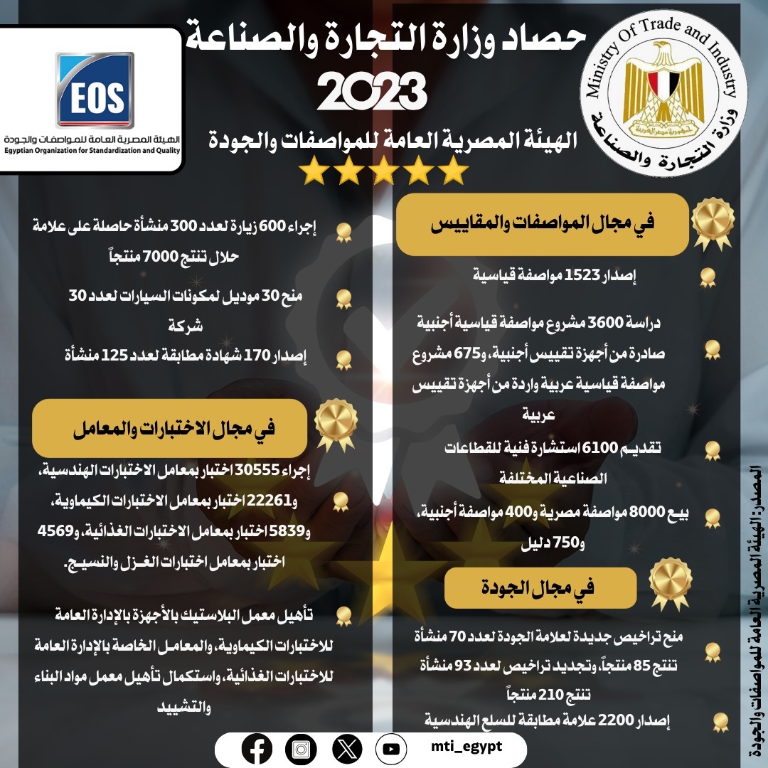 ورصدت الوزارة فى تقرير الصادر اليوم اهم الانشطة والانجازات التى تحققت فى الهيئة المصرية العامة للمواصفات والجودة خلال عام 2023