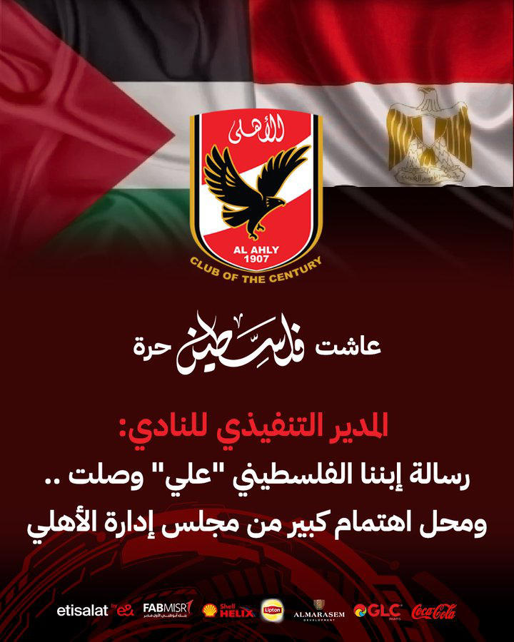 رسالة ابننا علي وصلت ومحل اهتمام كبير من مجلس إدارة الأهلي عاشت فلسطين حرة