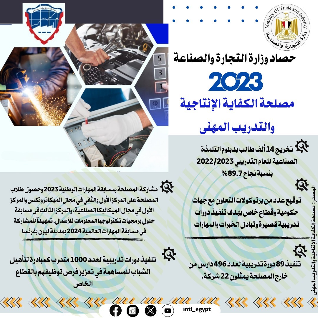 - تخريج 14 ألف طالب بدبلوم التلمذة الصناعية للعام التدريبي 2022/2023 بنسبة نجاح 89.7%.