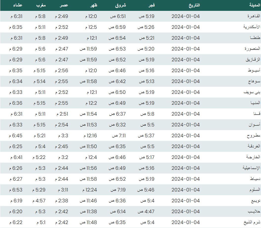 مواقيت الصلاة اليوم الخميس 4 - 1- 2024 في القاهرة والمحافظات