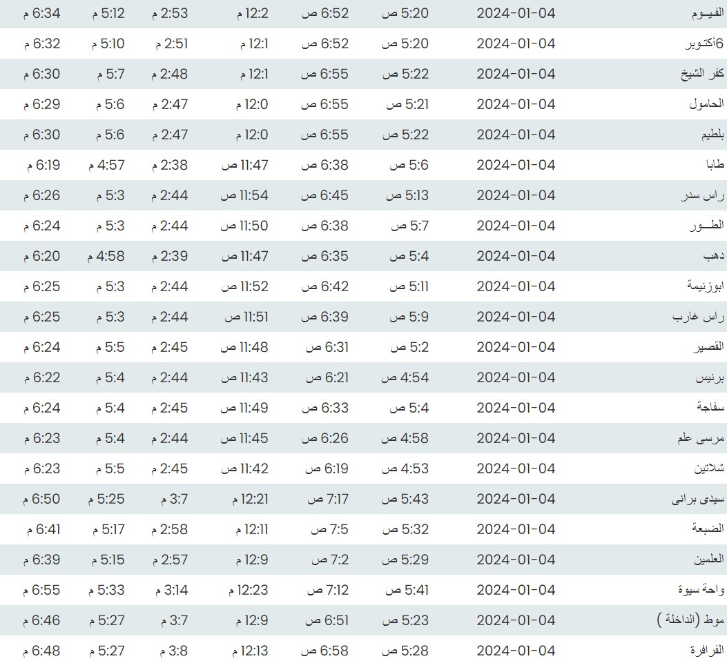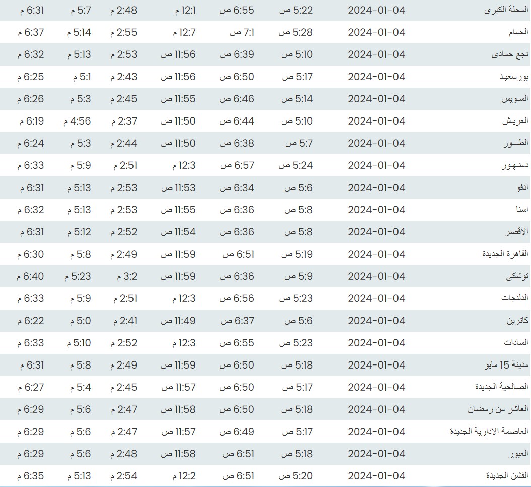 مواقيت الصلاة اليوم وفقًا للتوقيت المحلي لمدينتي القاهرة والإسكندرية وكذلك،مواقيت الصلاة، لعدد من مدن ومحافظات الجمهورية من واقع بيانات الهيئة العامة للمساحة
