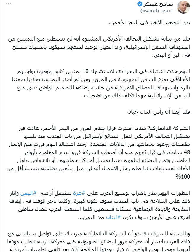 وأوضح عسكر "وبالنسبة للشركات فيبدو أن الشركة الدانماركية ميرسك على تواصل سياسي مع قادة الغرب باعتبار أن معركة مرور البضائع الصهيونية هي معركة غربية تتطلب موقفا أوروبيا موحدا، ومن الواضح أن قرار عودتها للملاحة كان بعد تلقي تطمينات أمريكية ثم العودة عن الملاحة بعد فشل هذه التطمينات.."
