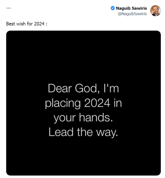 وقال ساويرس في مطلع أول يوم من العام الجديد عن أمنيات 2024: "مع أطيب التمنيات لعام 2024.. يا ربي إنني أضع عام 2024 بين يديك، وأنت تقود الطريق"