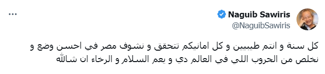 وعن أمنياته لمصر والعالم قال نجيب ساويرس: "كل سنة وأنتم طيبين وكل أمانيكم تتحقق ونشوف مصر في أحسن وضع ونخلص من الحروب اللي في العالم دي ويعم السلام والرخاء إن شاء الله"