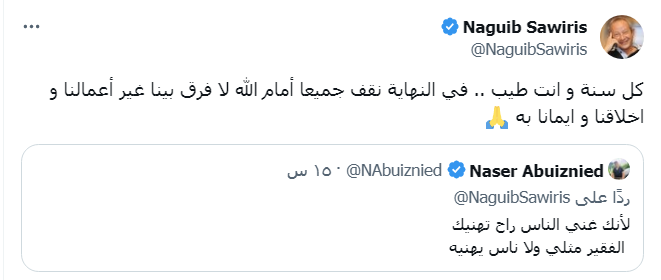 كما حقق المهندس نجيب ساويرس أمنية أحد متابعيه بتهنئته بالعام الجديد فقال: " كل سنة وأنت طيب.. في النهاية نقف جميعا أمام الله لا فرق بينا غير أعمالنا وأخلاقنا وإيمانا به".