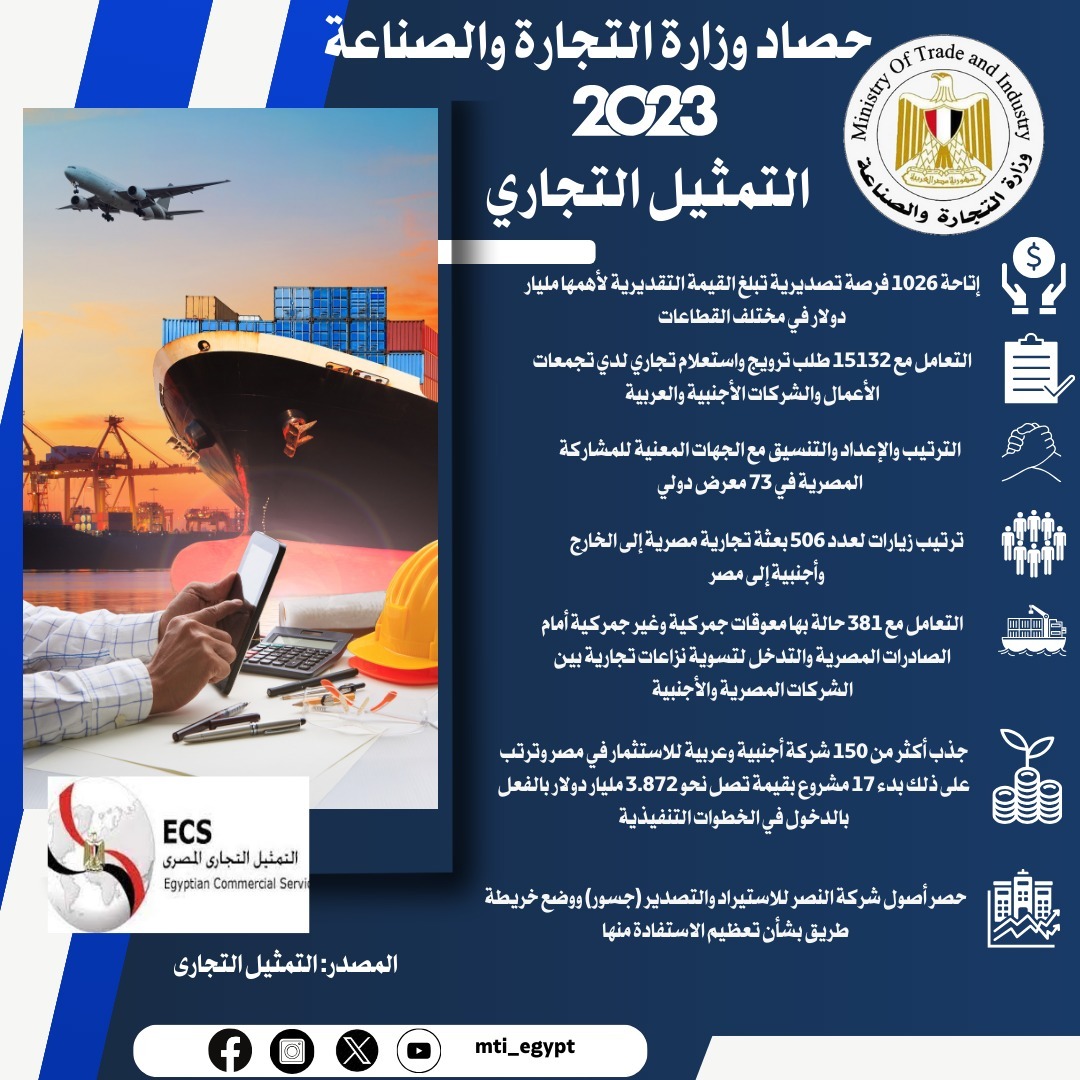 التمثيل التجاري: إتاحة 1026 فرصة تصديرية وجذب استثمارات بـ 3.872 مليار دولار خلال 2023