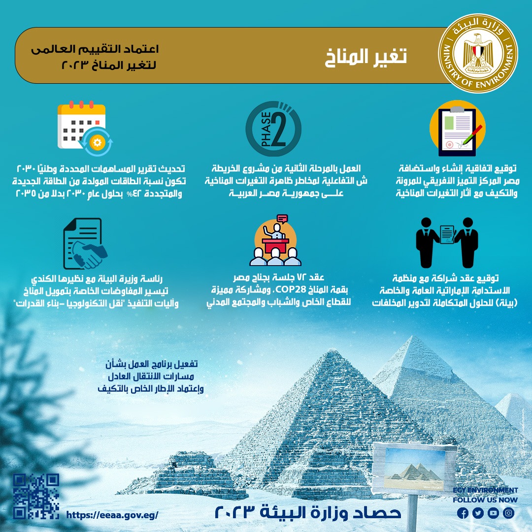 ونشرت وزارة البيئة انفوجراف عن حصاد عام 2023 في ملف تغير المناخ والذي شهد مسارًا مليئا بالجهود والإجراءات الواعدة للبناء على نتائج ومخرجات مؤتمر المناخ COP27، وصولا إلى مؤتمر المناخ COP28 بتعاون حثيث مع رئاسته، لتحقيق أهداف طموحة تدفع أجندة العمل المناخي.