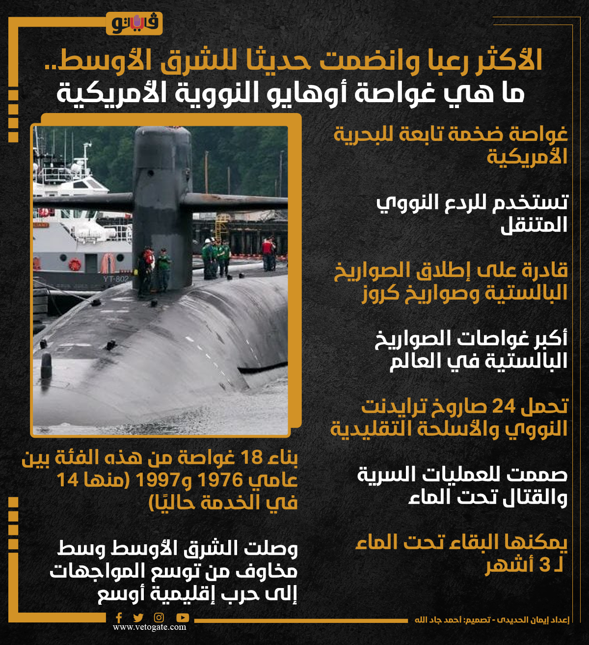بينما ذكرت شبكة CNN، إن الحجم الهائل للغواصة "أوهايو" التي تعمل بالطاقة النووية يسمح لها بحمل 154 صاروخًا توماهوك موجهًا