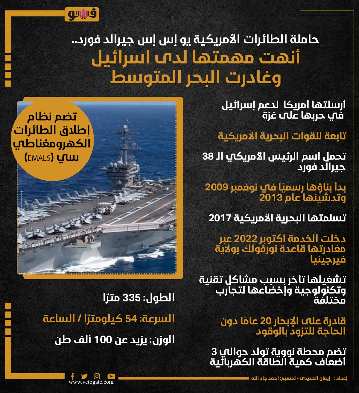 حاملة الطائرات الأمريكية يو إس إس جيرالد فورد.. أنهت مهمتها لدى إسرائيل وغادرت البحر المتوسط (انفوجراف) الأربعاء 10/يناير/2024 - 12:20 م 1/10/2024 12:20:09 PM حاملة الطائرات الامريكية،فيتو إيمان الحديدى شارك طباعة 18 حجم الخط شارك طباعة إسرائيل البحرية الامريكية أمريكا حاملة الطائرات الأمريكية ولاية فيرجينيا