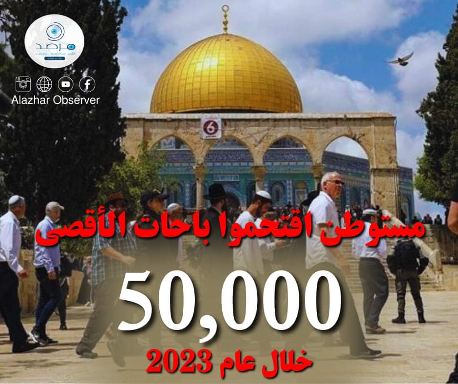 حمل عام 2023 بين طياته حلقات متتالية من التدنيس بحق المسجد الأقصى المبارك، من قبل عصابات ومنظمات جبل الهيكل المزعوم، والتي تتلقى دعما غير محدود من سلطات الاحتلال الصهيونية، خاصة في عهد هذه الحكومة اليمينية المتطرفة، ومن أبرز حلقات هذا التدنيس المستمر، هو اقتحام (50,098) ألف مستوطن لباحات المسجد المبارك خلال العام المنقضي، تحت حراسة أمنية مشددة من قبل شرطة الاحتلال، ليكون ثاني أكثر الأعوام انتهاكًا للأقصى منذ احتلال شرقي القدس عام 1967م، بينما كان عام 2022م هو أكثر الأعوام انتهـاكًا حيث سجل (51483) مقتحما.