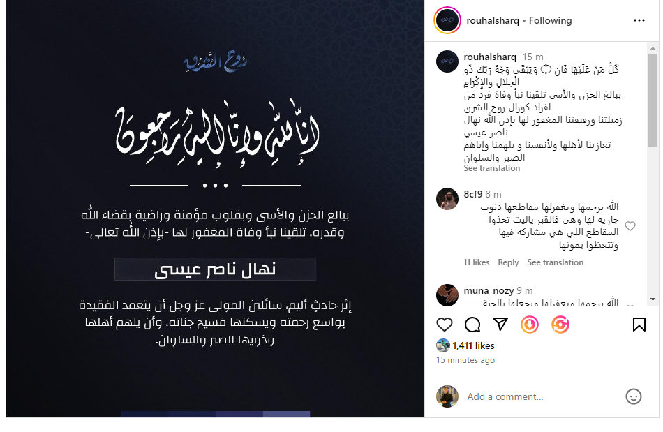في هذا السياق، نشرت الصفحة الرسمية لفريق كورال روح الشرق على موقع تبادل الصور والفيديوهات إنستجرام، صورة ينعى من خلالها أحد أفراده وتدعى نهال ناصر عيسى، قائلا: “كُلُّ مَنْ عَلَيْهَا فَانٍ وَيَبْقَى وَجْهُ رَبِّكَ ذُو الْجَلالِ وَالإِكْرَامِ، ببالغ الحزن والأسى تلقينا نبأ وفاة فرد من أفراد كورال روح الشرق، زميلتنا ورفيقتنا المغفور لها بإذن الله نهال ناصر عيسي، تعازينا لأهلها ولأنفسنا ويلهمنا وإياهم الصبر والسلوان”.