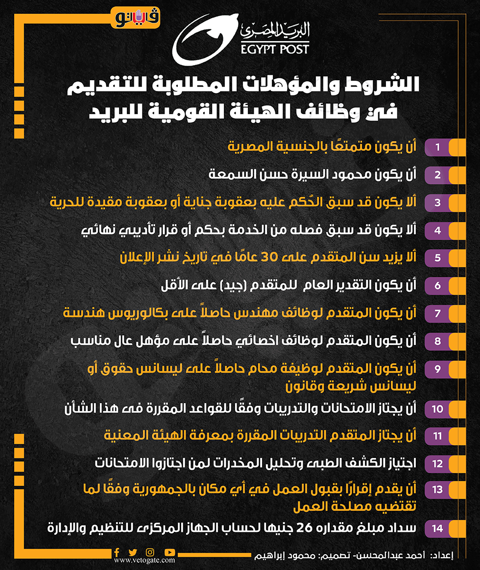 الشروط والمؤهلات المطلوبة للتقديم في وظائف الهيئة القومية للبريد (إنفو جراف) الخميس 11/يناير/2024 - 02:00 م 1/11/2024 2:00:50 PM التنظيم والإدارة،فيتو أحمد عبدالمحسن شارك طباعة 18 حجم الخط شارك طباعة الجهاز المركزي للتنظيم الهيئة القومية للبريد الوظائف الحكومية محافظات الجمهورية شغل الوظائف